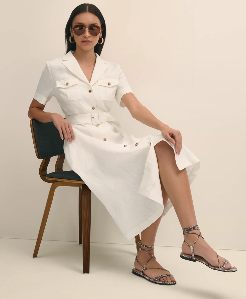 Our 100% linen dress melds utility style in a belted flare silhouette. We added a flattering wide V-neck with a notched collar and finished it with tortoise-shell patterned buttons for an elevated touch.