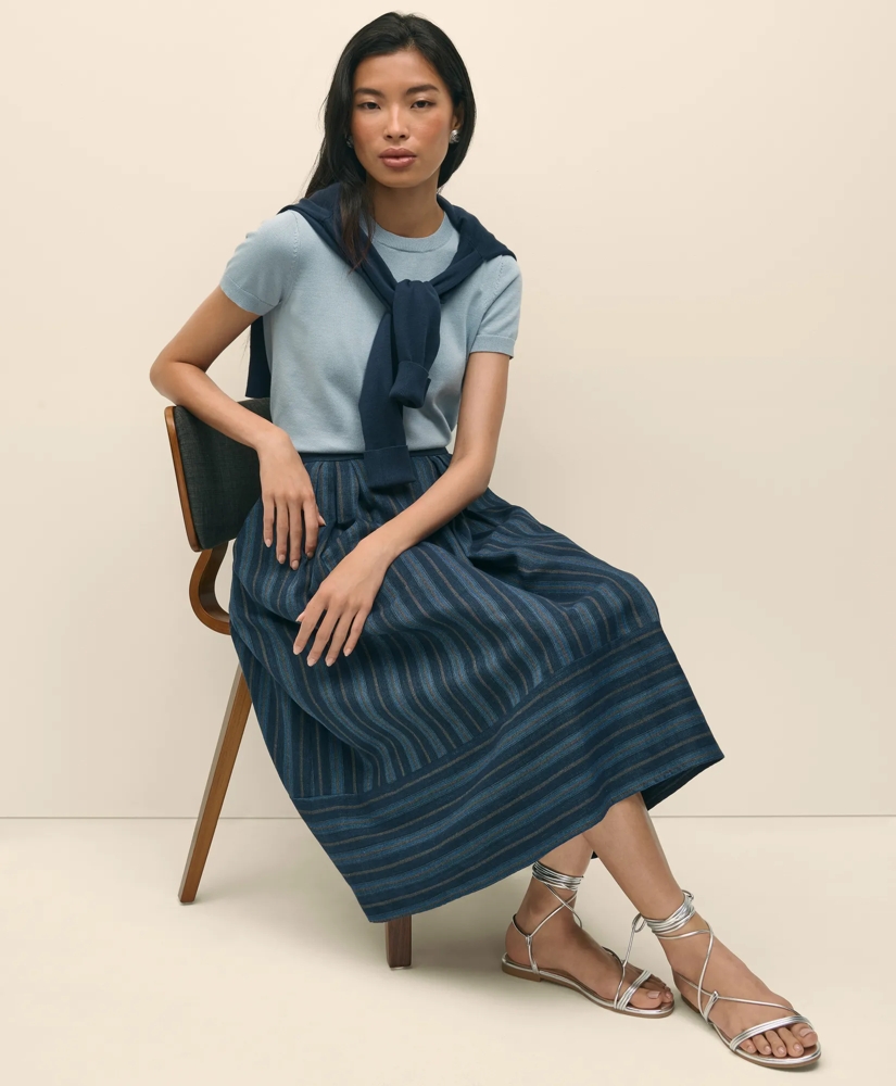 Linen-Cotton Striped Jacquard Pleated Skirt