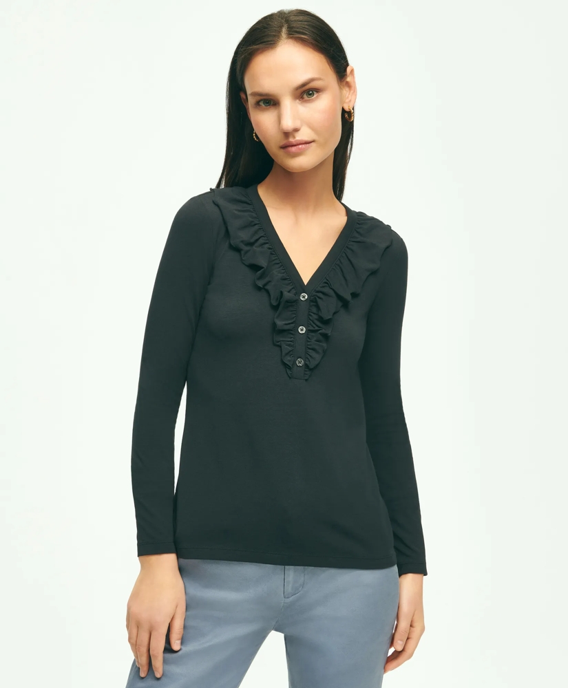 Cotton modal has a luxuriously soft look and an elegant drape. We added a ruffled V-neck with a functional three-button mother-of-pearl placket for an instant new staple.