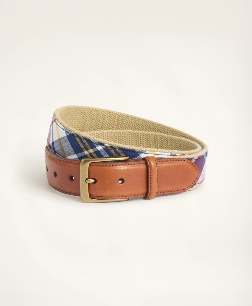 Classic madras adorns our genuine leather-tab belt for a nod to classic style.