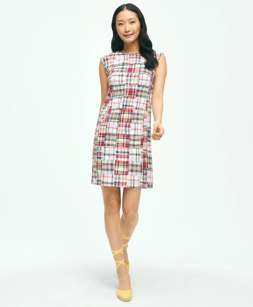 We've taken our authentic madras, a signature Brooks Brothers fabric, and given it a fresh feel in a new patchwork pattern. The elegantly simple shift silhouette will take its place in your wardrobe for years to come with its super-soft garment wash, flattering hip pockets and breathable cotton fabrication. Finish the look with our matching 3-button jacket.
