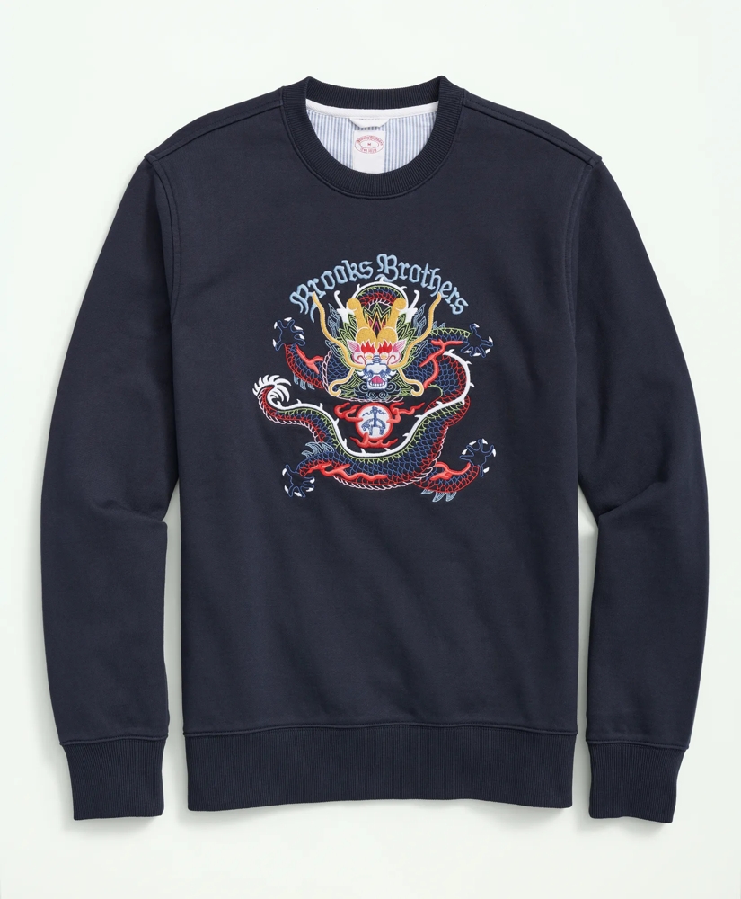 We're honoring good luck, strength and health this Year of the Dragon with an embroidered motif that adorns super-soft 100% French terry cotton. Additional features include ribbing at the collar and cuffs and our half-moon oxford neck lining.