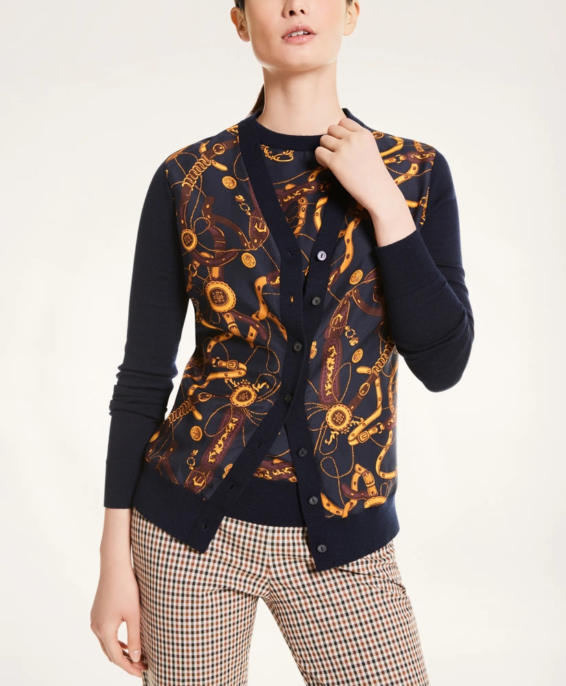 Worsted wool is adorned with silk-cotton panels featuring a rope print in a nod to classic style.