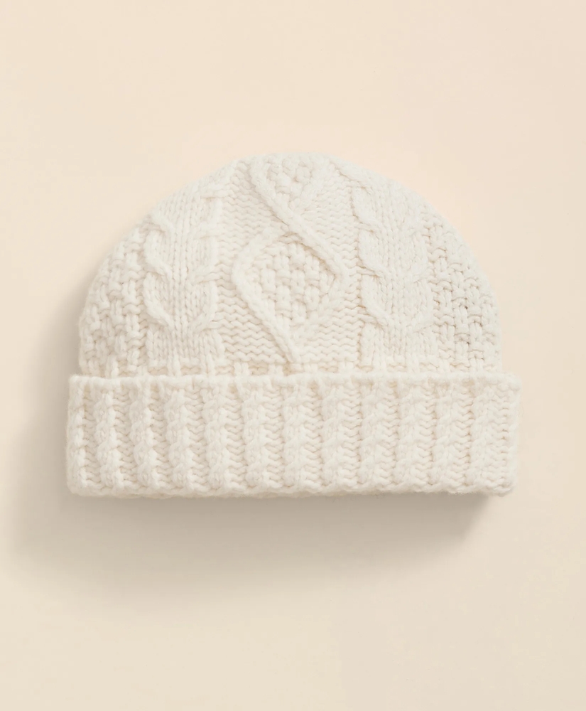 In a classic Aran, AKA fisherman, pattern, our merino wool hat keeps you warm in heritage style. Pair with our matching gloves for coordinated cozy accessories. They make a beautiful gift, too.