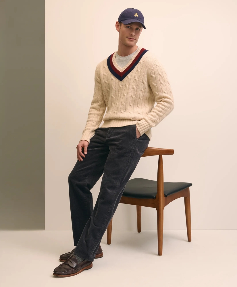 As a longstanding partner of the Tennis Hall of Fame, our label and this classic sport go together like your favorite doubles team. Our V-Neck with an all over cable knit and timeless tipping is made from ultra-soft merino wool.