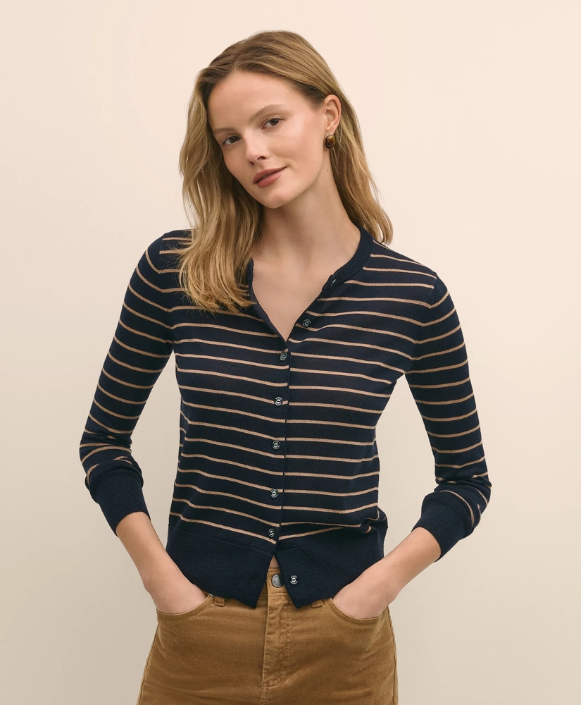 Elevate your stripes with our luxe merino cardigan that alternates between rich navy and camel hues for an updated classic. We finished with lustrous buttons for a feminine touch. Pair with our matching shell for a full look.