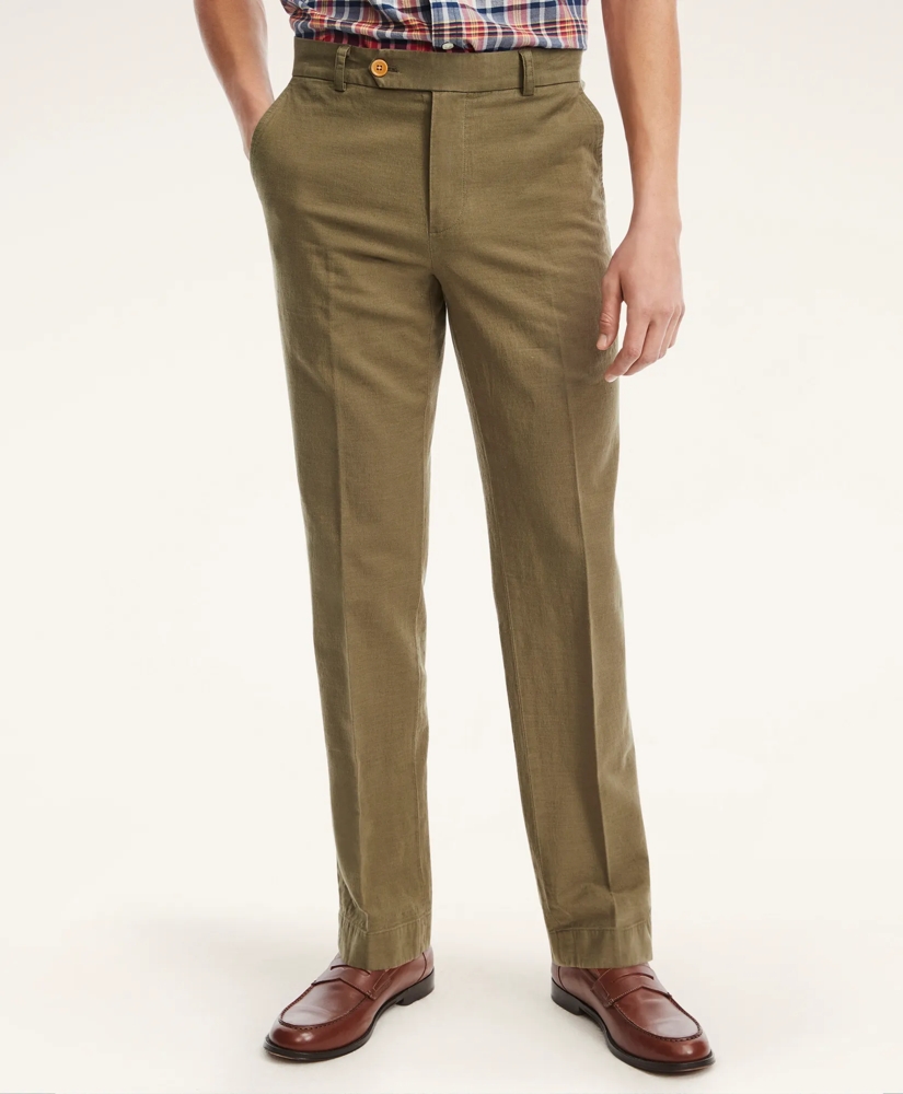 Comfortable style gets an upgrade in soft washed cotton woven with pure linen and just-right stretch. Our signature oxford-cloth interior details mark a Brooks Brothers classic.