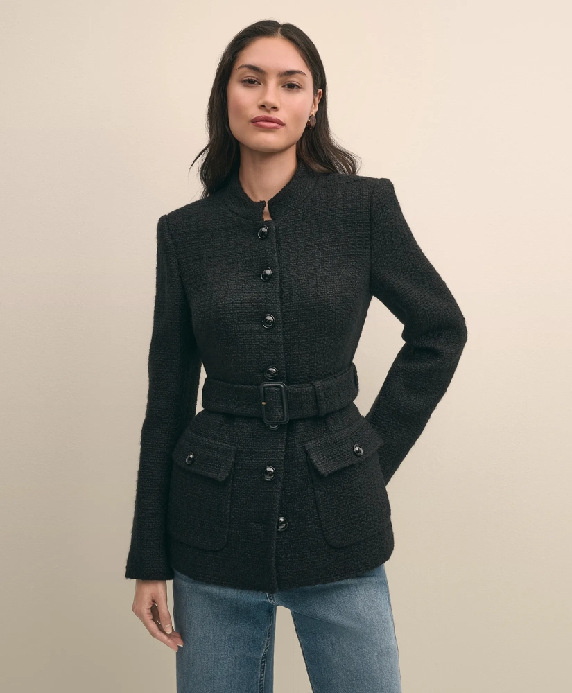 Drawing inspiration from classic military uniforms, our jacket offers a refined take on heritage style. Done in richly textured boucle, it features a modern band collar, polished buttons, and a removable leather-buckled belt that defines the impeccably tailored silhouette. We finished with our signature grosgrain trim for a discreet touch of quality.