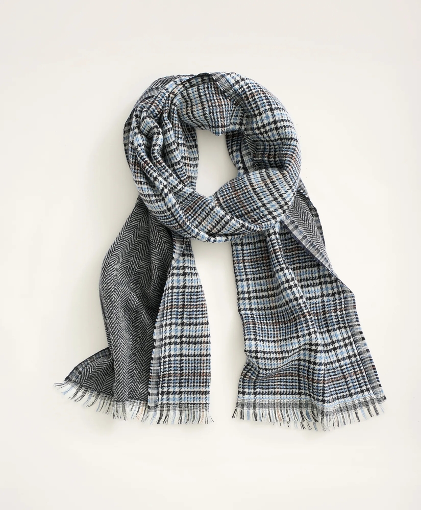 Crafted from pure virgin wool. Double faced scarf featuring glen plaid and herringbone patterns. 15" x 70" with 0.5" fringe. Made in Italy. Dry clean.
