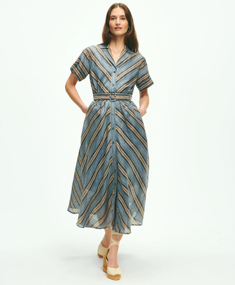 Nipped-Waist Chevron Shirt Dress In Linen Blend