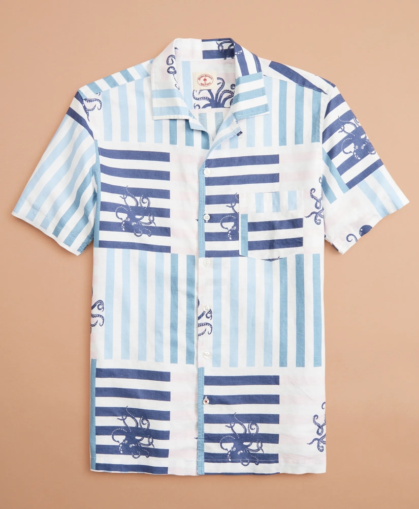 This cool shirt is made for summer, from its lightweight and breathable linen-cotton construction to its classic open collar. An all-over octopus print with stripes gives it bold style. Finished with a chest pocket.