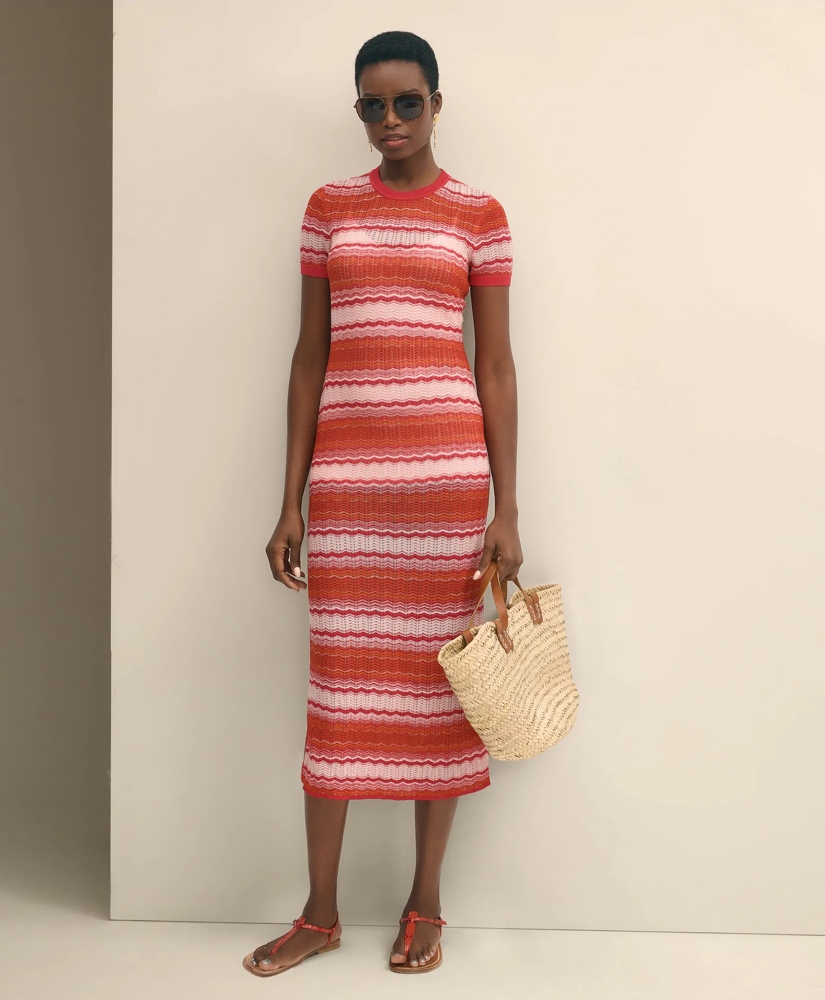 In warm shades of pink, orange and fuchsia, our light sweater dress is a standout style for the season. Done in a delicate pointelle knit, this look will be a signature piece for spring.
