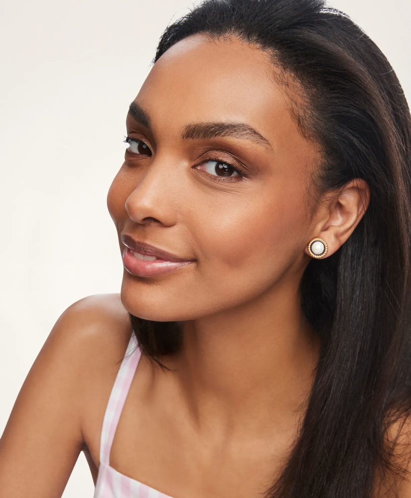 Beautiful pearl stud earrings offer classic sophistication with a navy enamel border in our rope-chain setting.