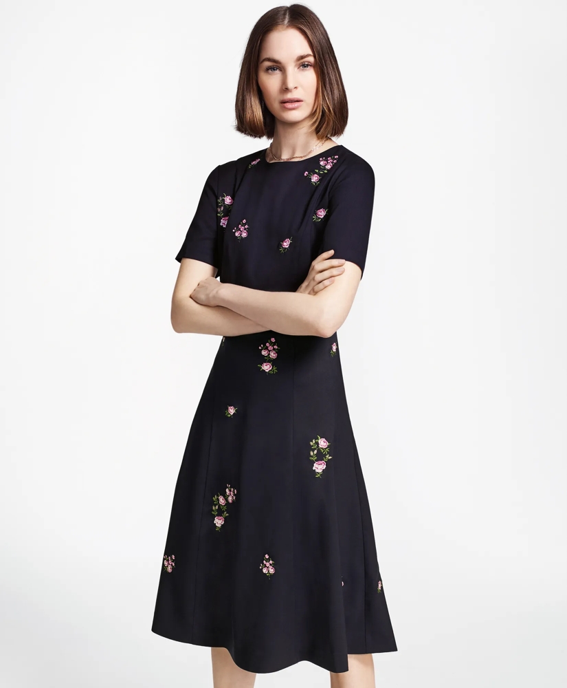 We've given this classic navy dress a fresh, feminine finish with beautiful floral embroidery. Tailored from luxe wool woven with a touch of stretch from Italy's Tollegno mill, this A-line silhouette features a jewel neckline, short sleeves, a fluid full skirt and a concealed back zip closure. Fully lined.