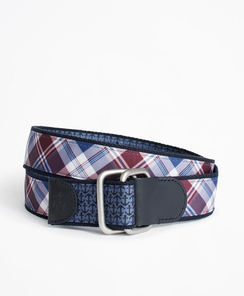 Reversible belt with plaid and solid motif. D-ring closure with leather end tabs.