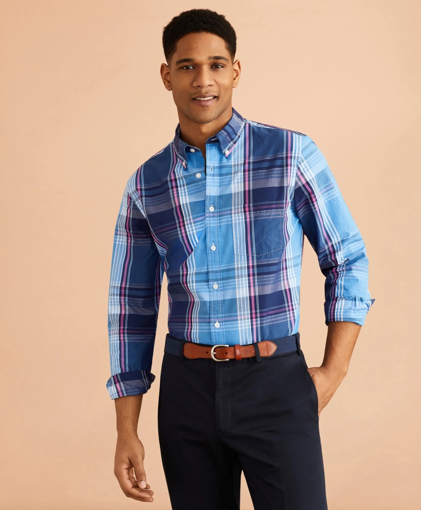 Pure cotton and a rich plaid pattern make this soft broadcloth shirt easy to dress up or down. Styled with a classic button-down collar, a chest pocket, our signature 6-Pleat Shirring® at the barrel cuffs and a box pleat at the back yoke. Our logo appears on a tab at the lower hem.