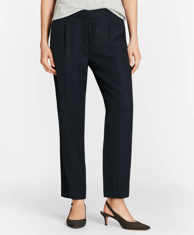 The perfect fusion of timeless polish with an on-trend, nonchalant air, this chic pair mixes classic pleat-front styling with fluid, lightweight fabric. These effortless pants feature a hook-and-bar closure, a zip fly, front slant pockets, back welt pockets and a set-on waistband with an elasticized back for added comfort.