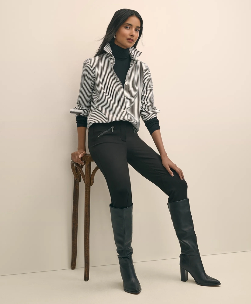 We've done these pants in a beautifully flexible, yet substantial, ponte knit that fits like a glove. In a nod to our equestrian inspiration this season, we added classic riding details, like snap buttons and jodhpur patches at the interior knees.
