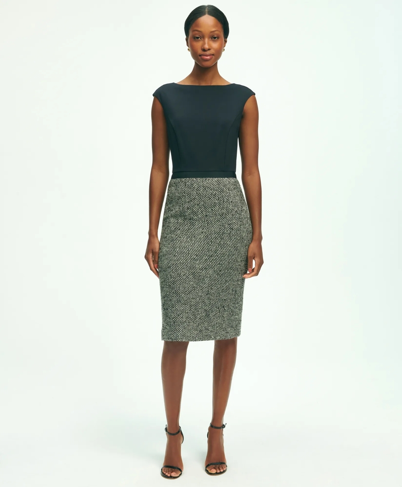 Calling to mind classic American style, our dress is crafted from tweed and soft ponte knit that offers chic comfort from the board room to the dining room. Pair with our matching jacket for a timeless statement.