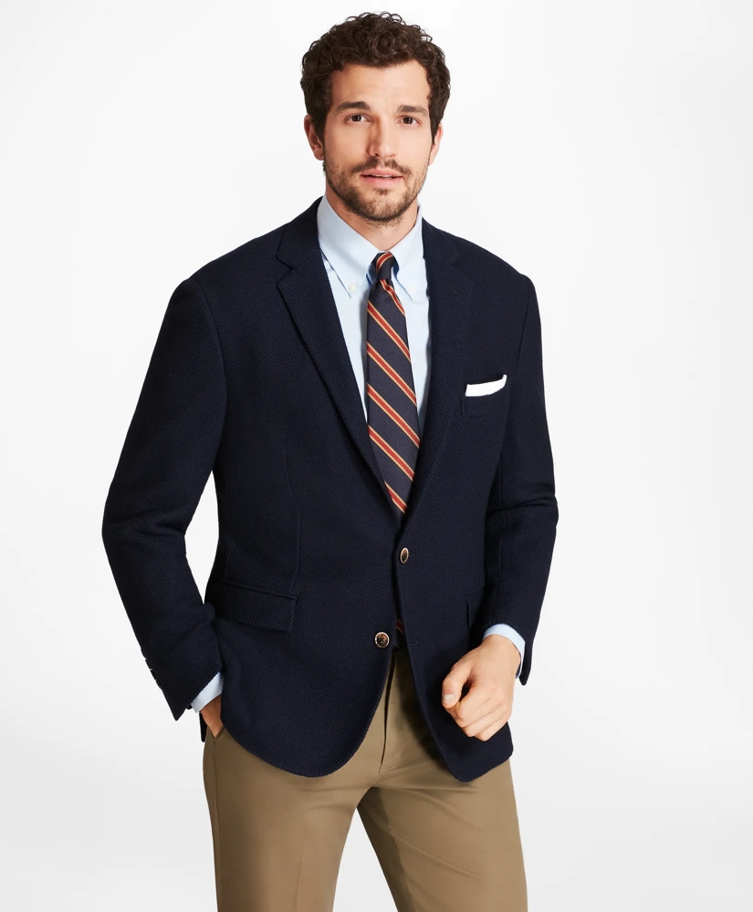 Classic two-button blazer made from 100% textured wool woven in Italy. Side vents and half-lined. Regent fit. Dry clean. Made in the USA from imported materials.
