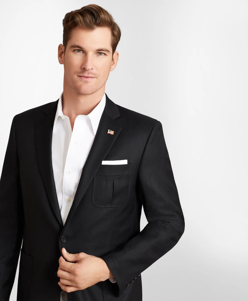 Blazer made with 100% wool woven in Italy by Loro Piana®. Plain weave fabric. Three-button tipover silhouette with a center vent. two front patch pockets at waist and one gusseted patch pocket at left chest. Regent fit. Made in USA in our own factory.