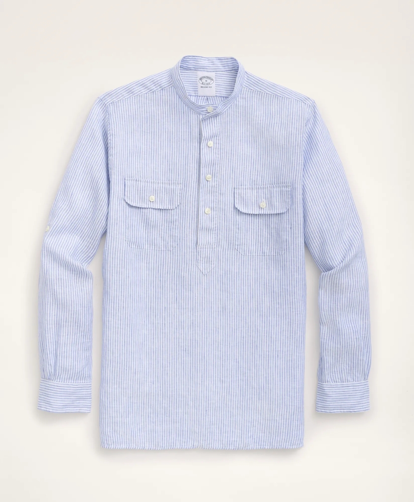 Modern yet classic, ultra-comfortable yet polished, our new linen popover features a banded collar and easy half-placket to go with its perfect mini stripe. Additional features include adjustable sleeve tabs and two flap button closure chest pockets .The fabric for this style is woven for us by the renowned Baird McNutt mill in Ireland, which has been making the world's finest linen since 1912.