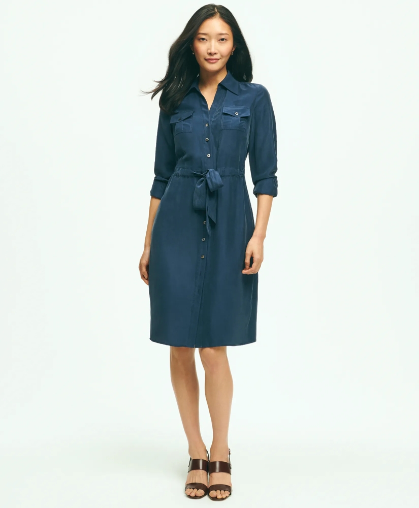 So-soft silk habotai and mother-of-pearl buttons add a feminine element to the functional details of this. Layer it with jackets and sweaters in transitional temps, and wear it solo with sandals and loafers when temperatures rise. Bonus: waist cinching drawcord and pockets!