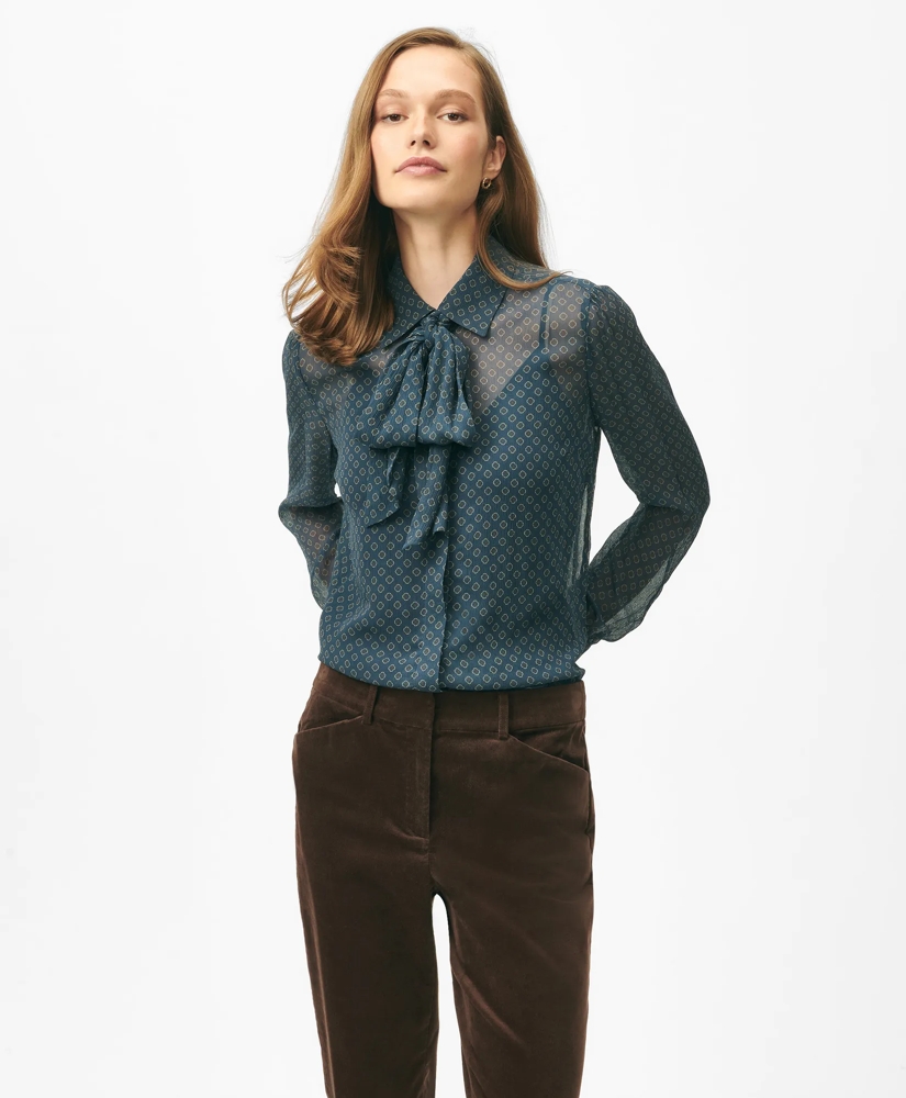 Meet one of your new favorite blouses. Flowing silk georgette in a foulard motif with a removable neck tie makes for a classic addition to your wardrobe. Pair it with jeans for casual polish or a leather pencil skirt for a mix of cosmopolitan style. We finished it with a removable camisole for styling versatility.