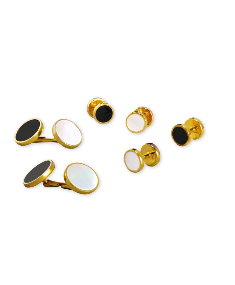 Elegant accents for the well-dressed man. Complete with four studs and two cuff links. Genuine onyx and mother-of-pearl. Imported.