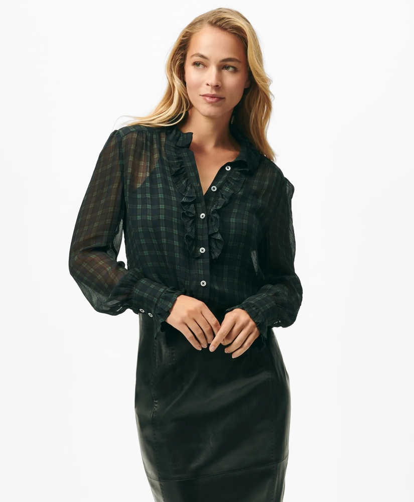 A feminine approach to your shirting wardrobe, our blouse is cut from beautiful chiffon and features shirred shoulders and ruffled details at the collar, placket and cuffs.
