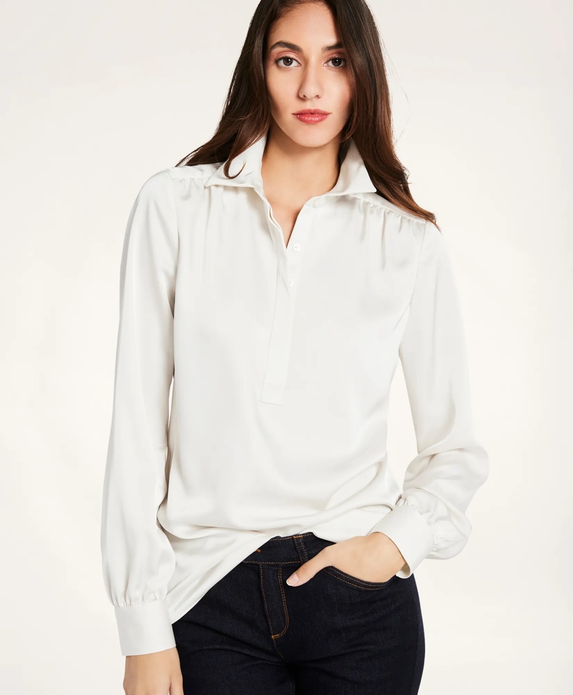 A relaxed silhouette in popover construction that features gathered shoulder seams in a satin finish is the perfect fall update.