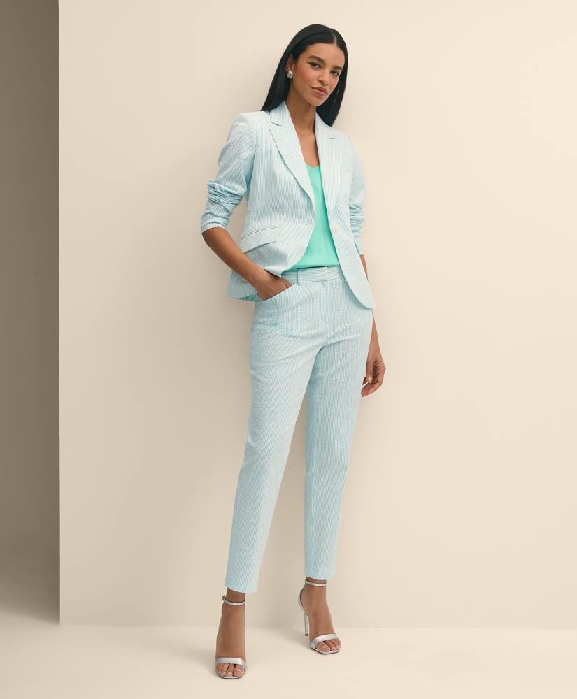 In the 1930s we increased the collective cool factor of American style when we popularized seersucker for summer. Our pants boast just-right stretch for comfortable movement. We updated this pair with so-pretty turquoise stripes. Pair with our matching jacket for a coordinated look.