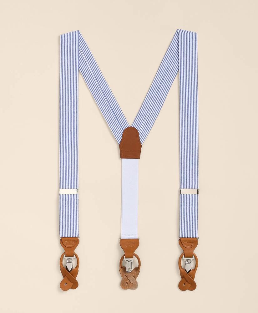 Our suspenders are crafted from durable elastic for lasting wear. Leather trim and a seersucker pattern add a seasonal, gentlemanly finish.