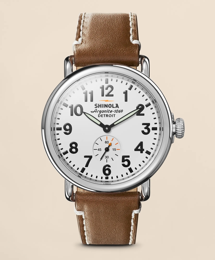 A cool new addition to our accessories collection: Shinola's flagship timepiece is built to last, and named accordingly. Polished hands and lustrous indices pop against the beautiful dial. The look is brought together by a stainless-steel case and refined leather strap. The hands and calendar aperture are powered by the Argonite 705 movement. And like every Runwell, it features their signature calling cards: Wire lugs, a pumpkin crown and iconic caseback, all proudly designed and assembled in the Detroit factory. Makes a great gift, or just a treat for yourself.