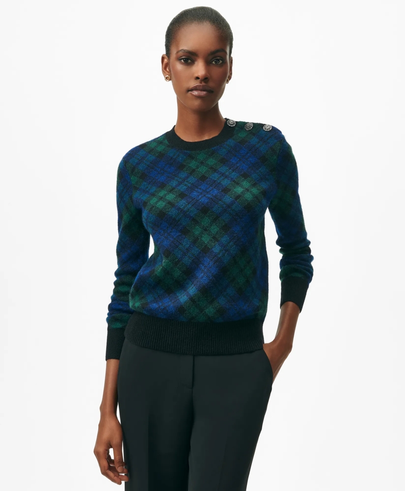Meet the sweater you'll love today and for seasons to come. We've adorned this piece with jeweled accent buttons at the shoulder and a bias Black Watch tartan pattern. Crafted from a so-soft alpaca-wool blend, it's your elevated way to stay cozy in style.