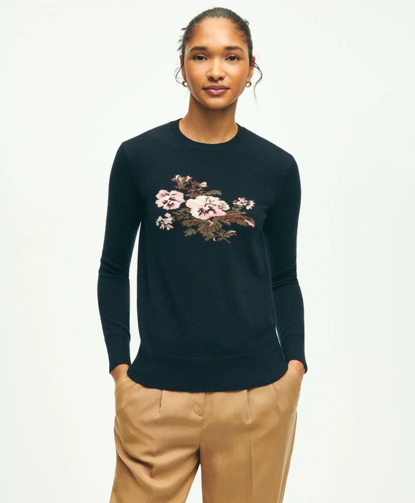 Silk Cashmere Floral Intarsia Crewneck Sweater