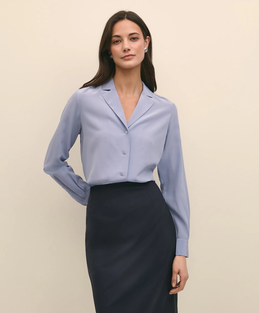Incredibly chic and perfectly luxe, our blouse is crafted from 100% silk in delicately textured crepe. We finished it with an open V-neck line to flatter, and luxe mother-of-pearl buttons.