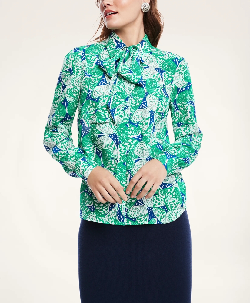 Our stunning print of the season is crafted from luxurious silk georgette, and features a removable pussy bow, bishop sleeves and looks just as beautiful tucked in as it does loose, over your favorite pants.