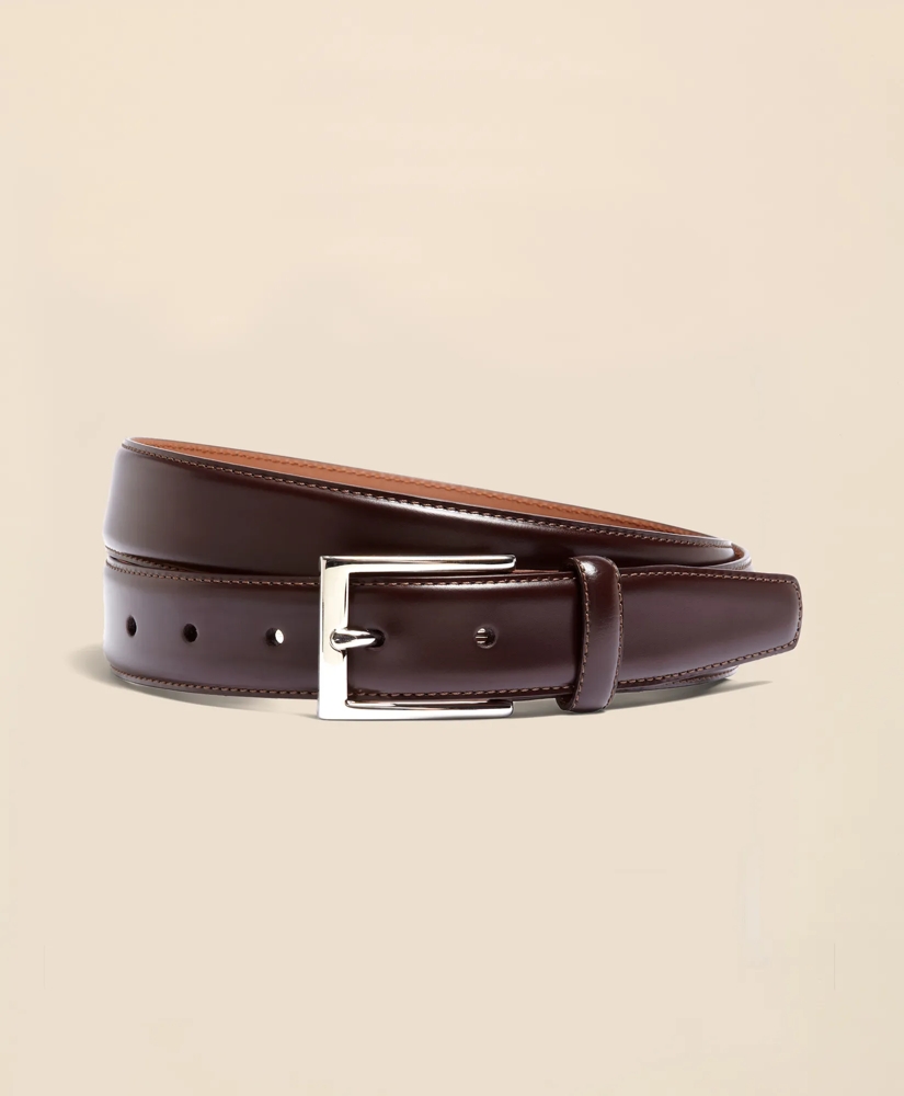 Calfskin leather belt with light nickel-plated brass buckle. Stitched edges. Leather lining. 1.25" wide.