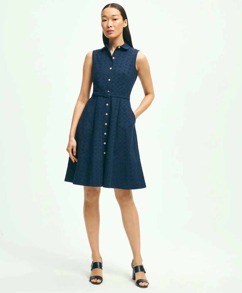 Sleeveless Cotton Eyelet Belted Shirt Dress