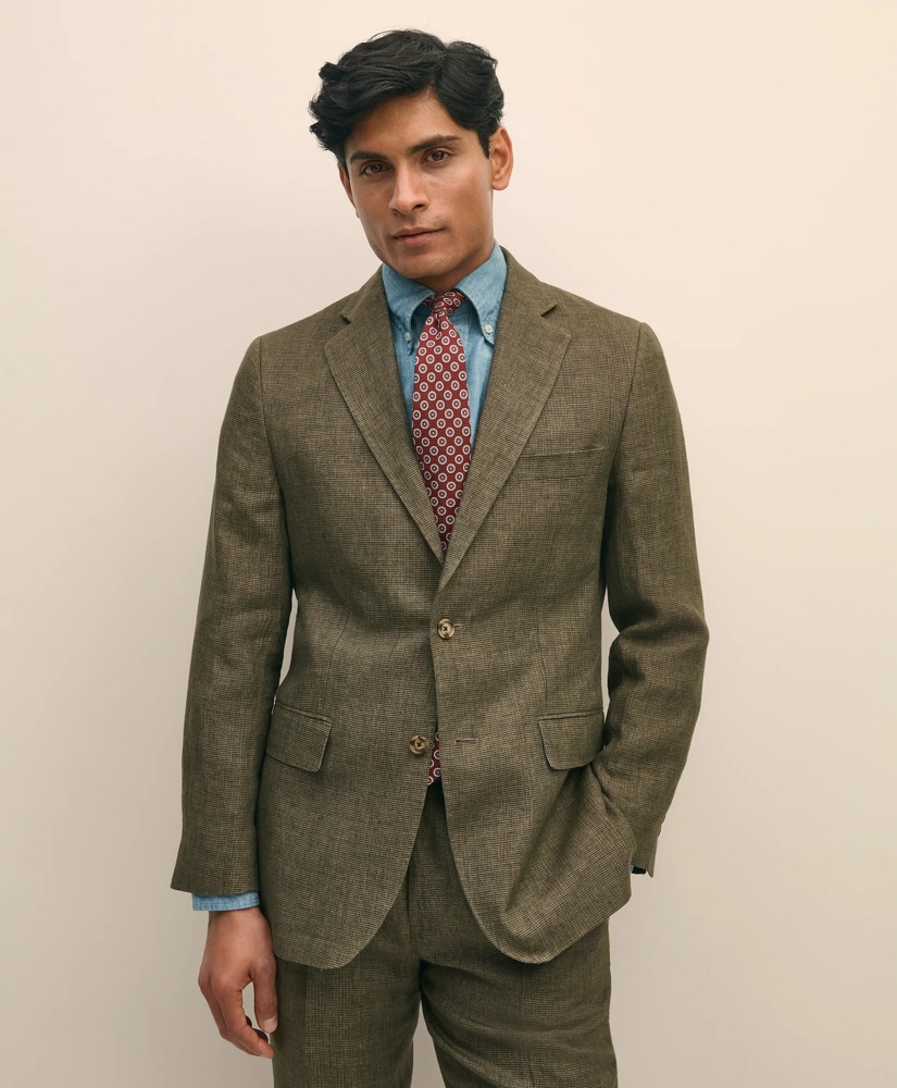 Crafted in a beautifully breathable linen woven in Italy in a classic houndstooth pattern, this suit jacket was inspired by all-American heritage style. Featuring a notch lapel and a soft construction shoulder for a natural drape and double-breasted construction for a refined finish.