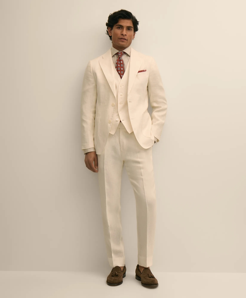 Crafted from pure linen woven by Italy's lauded Leomaster mill, our suit pants feature ideal seasonal comfort and style. A half-lining to the knee offers must-have functional style. We finished with a single-pleated front for a clean, classic look. Pair with our matching suit jacket and vest for a full three-piece look.