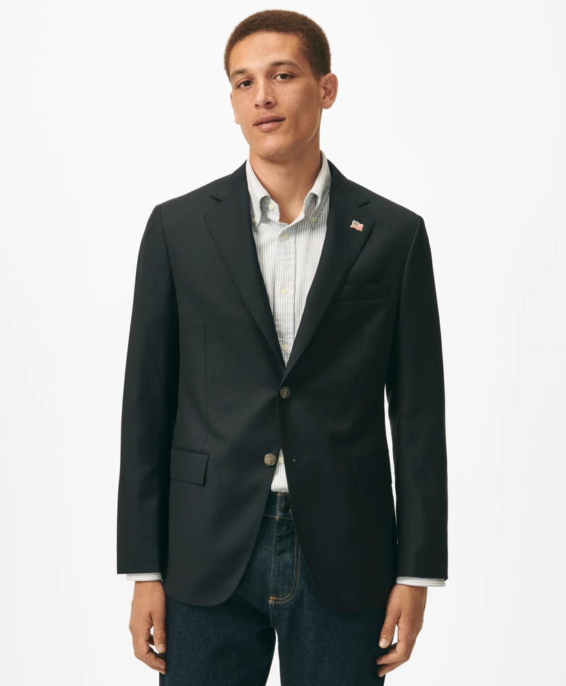 The origin of the classic 1818 blazer is part of fashion lore. From boating teams sporting the piece in the 1820s to the captain of the HMS Blazer outfitting his crew in the now-classic tailored jacket to country club members boasting bright stripes on their jackets known as blazes, one thing is certain, Brooks Brothers was there from the beginning. Our blazers remain iconic, with the quality you expect, and the traditional details like silver-toned buttons, you love. This blazer, crafted in the USA, features a classic 2-button front made from Saxxon™ wool woven by Loro Piana® in Italy.