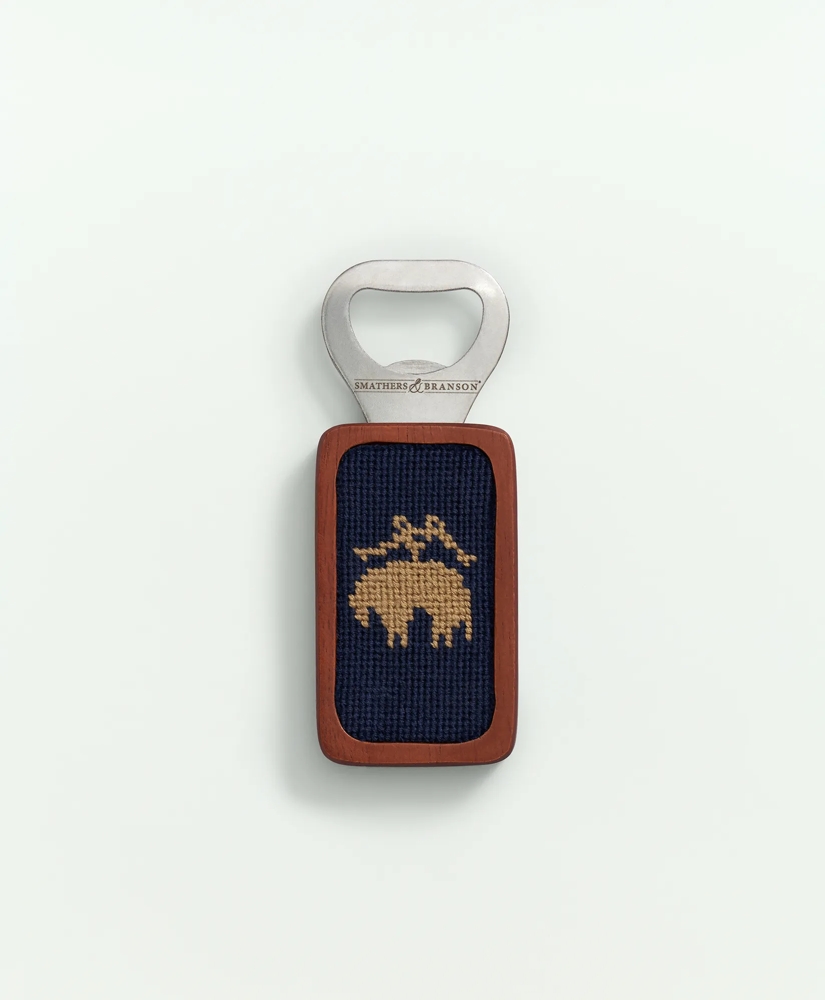 Every house, home and guest cottage needs at least one. This Smathers & Branson bottle opener with a wood handle, cotton needlepoint insert, stainless steel opener and hidden magnet adds a touch of classic all-American style to your decor.