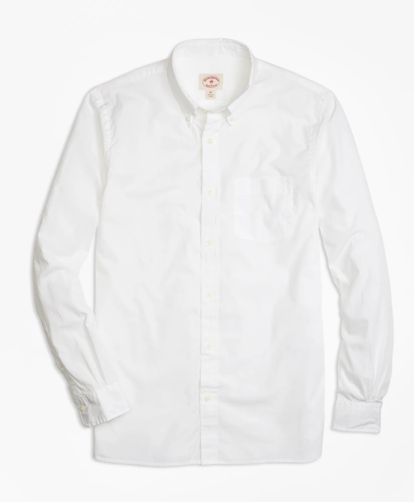 Sport shirt, made from cotton broadcloth. 3" button-down collar with center back button. Pocket at left chest. Deep yoke. Barrel cuffs with signature shirring. Side gussets.