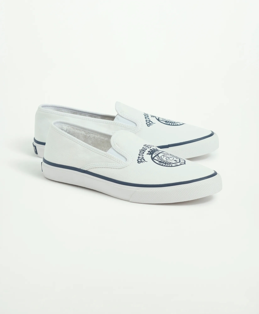 Rep the prep in this classic all-white twin gore slip on sneaker. Designed in collaboration with Brooks Brothers, this twin gore sneaker features crisp white uppers with the famous Brooks Brothers crest on the instep. The terry cloth lining feels luxurious and soft on your feet, while our signature Razor-Cut Wave-Siping™ delivers ultimate wet/dry traction. Comfortable and stylish, this sneaker is ready for brunch, the beach, or a day by the water.