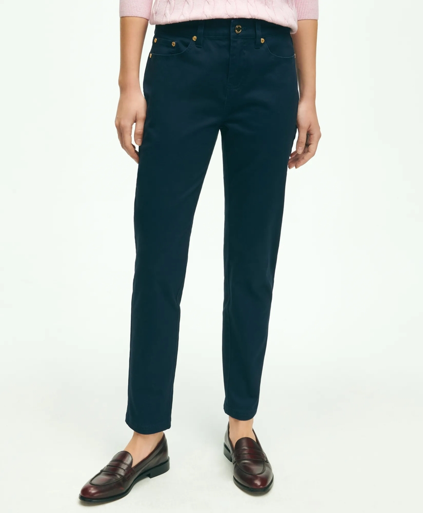 In a flattering slim-straight cut with elevated gold trim detail, our stretch cotton pants are ready for their close-up in new seasonal colors.