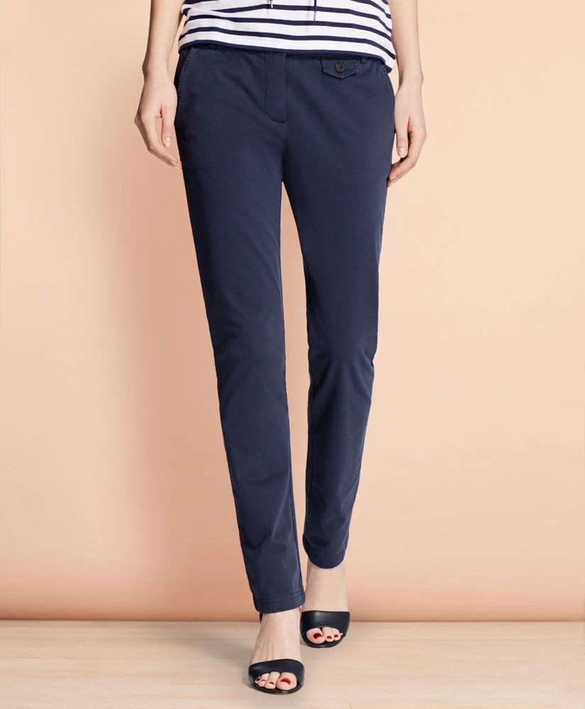 Our stretch-cotton twill pants have two front welt pockets, two back welt pockets and a coin pocket on the front left side. On the waistband is a functional tab detail for adjustments. The inside of the waistband and pockets are lined in stripes.
