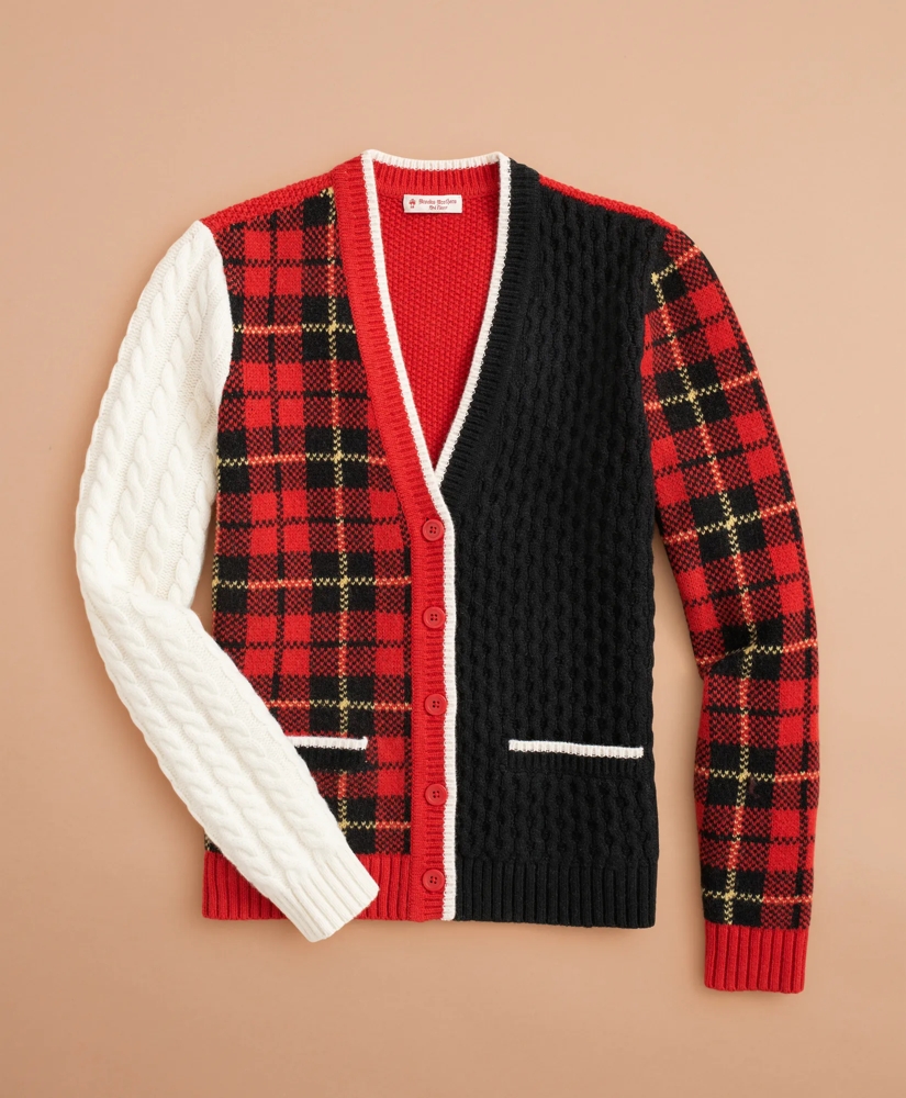 Make a fun statement this holiday season in our cheerful patchwork tartan cardigan. Knit from cozy Italian merino wool with a touch of stretch, this sweater features a V-neckline, a button placket and front pockets.