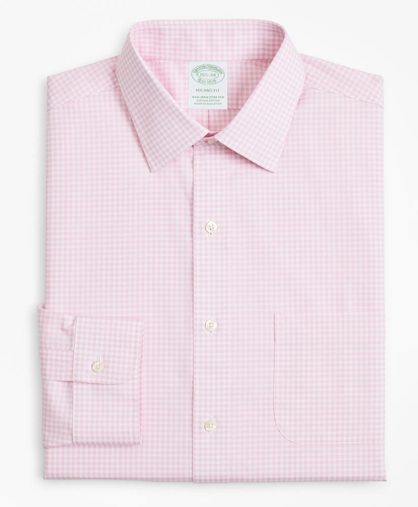 Our non-iron dress shirt is crafted from stretch poplin woven from American-grown Supima® cotton and elastane. Finished with the established Ainsley collar that measures 4" from point to point. It is specially treated to resist wrinkles, and our signature 6-Pleat Shirring® at the barrel cuffs and pucker-free seams reinforce Brooks Brothers' dedication to a well-made dress shirt. Additional features include a left chest pocket. Machine wash according to care instructions for best performance. Imported.